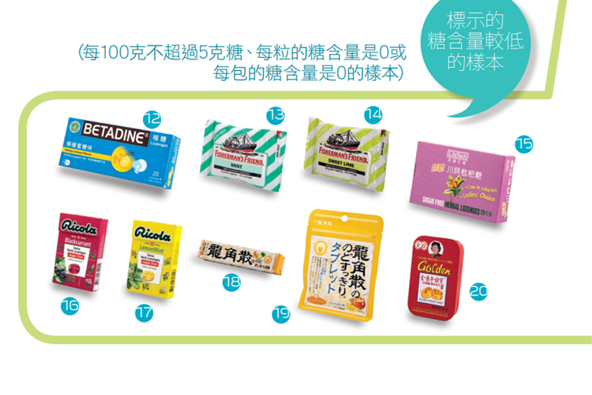 另外30 款屬一般食品的喉糖樣本,雖然毋須如藥品般詳列成分的含量、服用量及服用方法,但需列出營養標籤資料,而消費者須注意的是糖含量。檢視樣本的營養標籤發現 22 款含有糖分,每粒喉糖的糖含量由 0.02 克至 3.8 克不等,當中近半數(14 款)樣本的糖分佔總成分 7 成或以上,更有 3 款樣本每粒含糖量超過 3 克,當中龍角散標示的含糖量最高(每粒3.3克)。