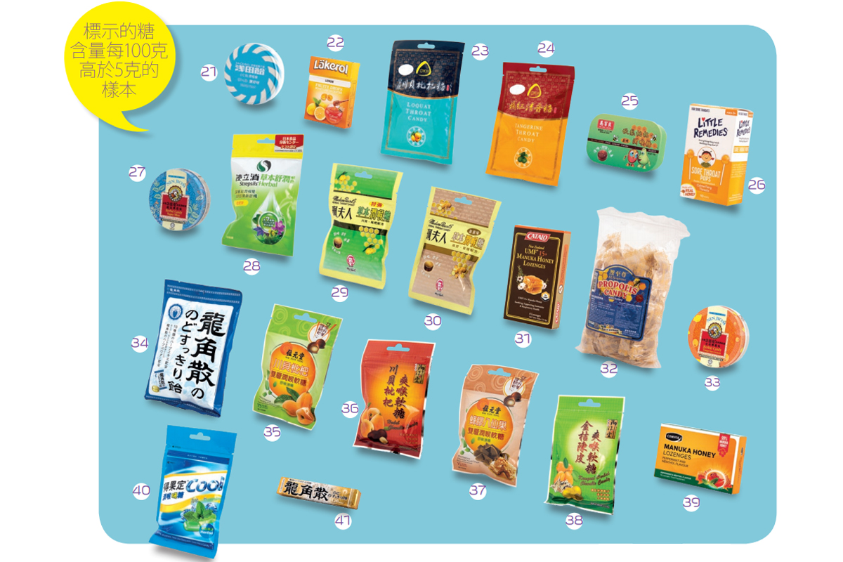 消委會檢視市面上41 款喉糖的標籤資料,包括成分、健康聲稱、糖或甜味劑含量以及建議服用劑量。當中10 款屬於註冊西藥;1 款為註冊中成藥;餘下 30 款屬一般食品。部分樣本的標籤未有清晰列明每日服用上限以及服用方法,慎服警示也未及全面。雖然喉糖含西藥的劑量很低,但因產品可隨意於零售店購買,消費者容易掉以輕心,若過量服用,對兒童、孕婦及哺乳婦女的健康影響甚大。